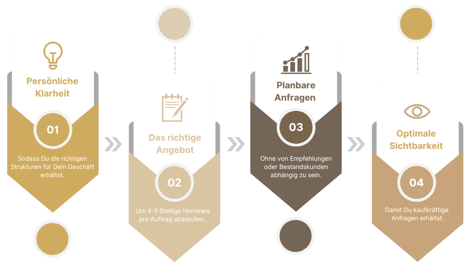 Das Einzige, das Du brauchst ist eine auf Dich angepasste Schritt-für-Schritt-Anleitung, sodass Du Dein bestehendes Geschäft  weiter ausbauen, Dein Honorar steigern und Dich voll und ganz auf deine Leidenschaft konzentrieren kannst.